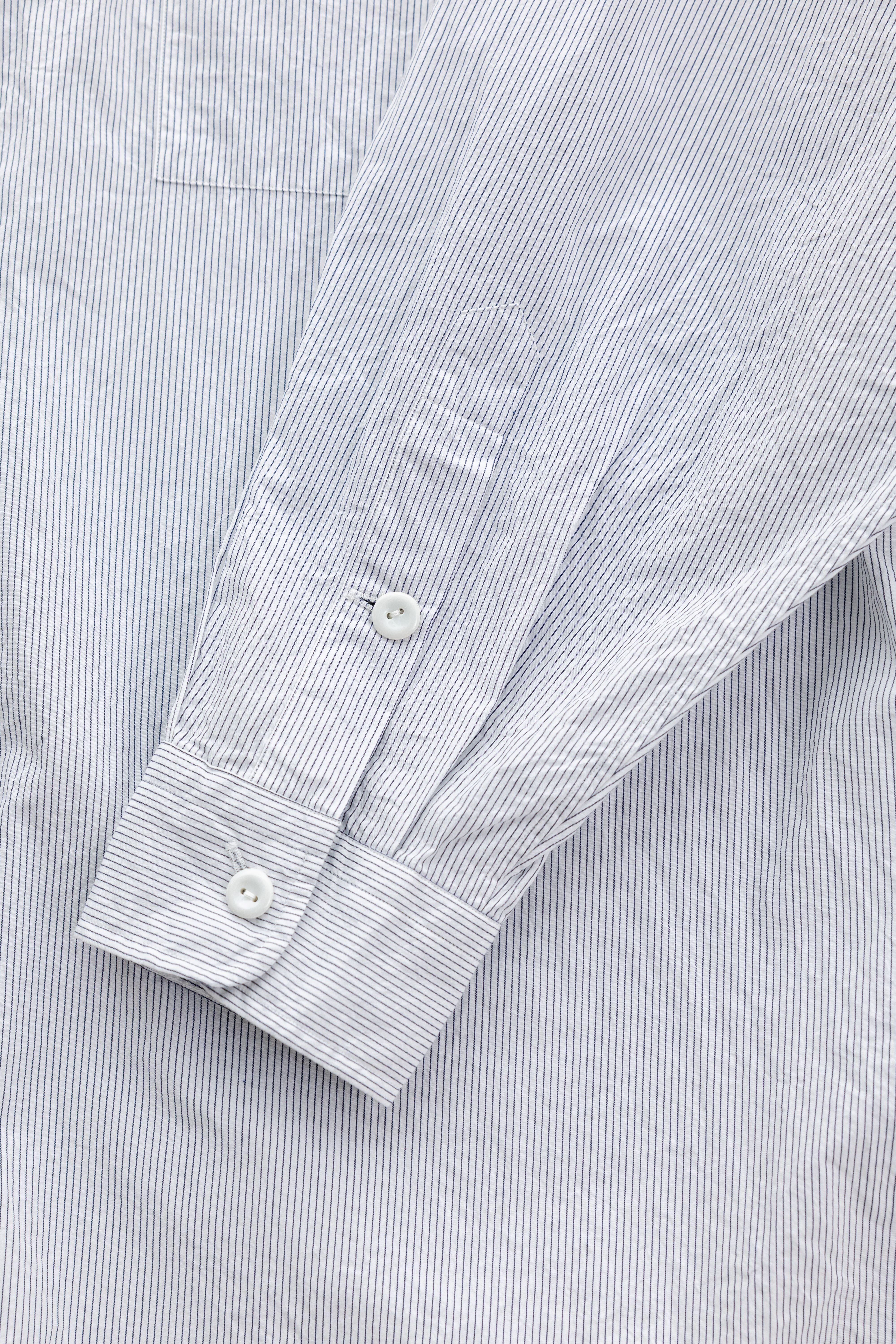 サラッとした素材感のコットン100%のブロードストライプ生地を使用し、やや凹凸感の出やすい素材で、強度があり、キレイ目にもカジュアルにも重宝します。